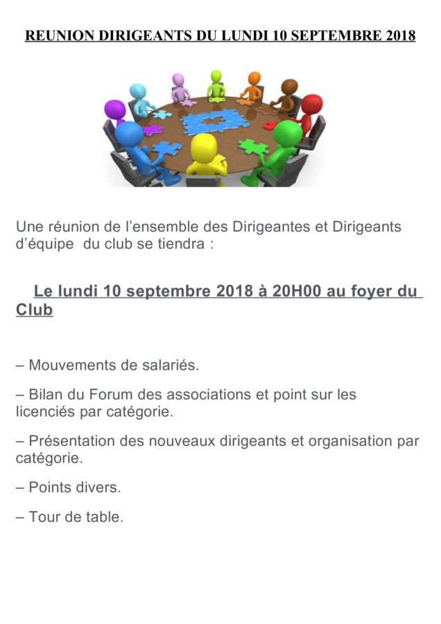 Une réunion de l’ensemble des Dirigeantes et Dirigeants d’équipe du club se tiendra : Le lundi 10 septembre 2018 à 20H00 au foyer du[…]
