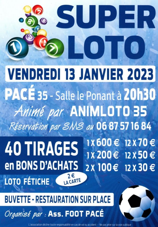 Après 2 ans d’interruption, notre traditionnel loto revient, et pour marquer son retour, il aura lieu ce vendredi 13 janvier 2023. Avec plus de 3 000 € de lots à la clé, il sera Animé par Animloto35 et se déroulera au Ponant à 20h30. Le CO.Pacé sera présent sur place pour vous servir, à la buvette, à la restauration, et vous faire passer une belle soirée.