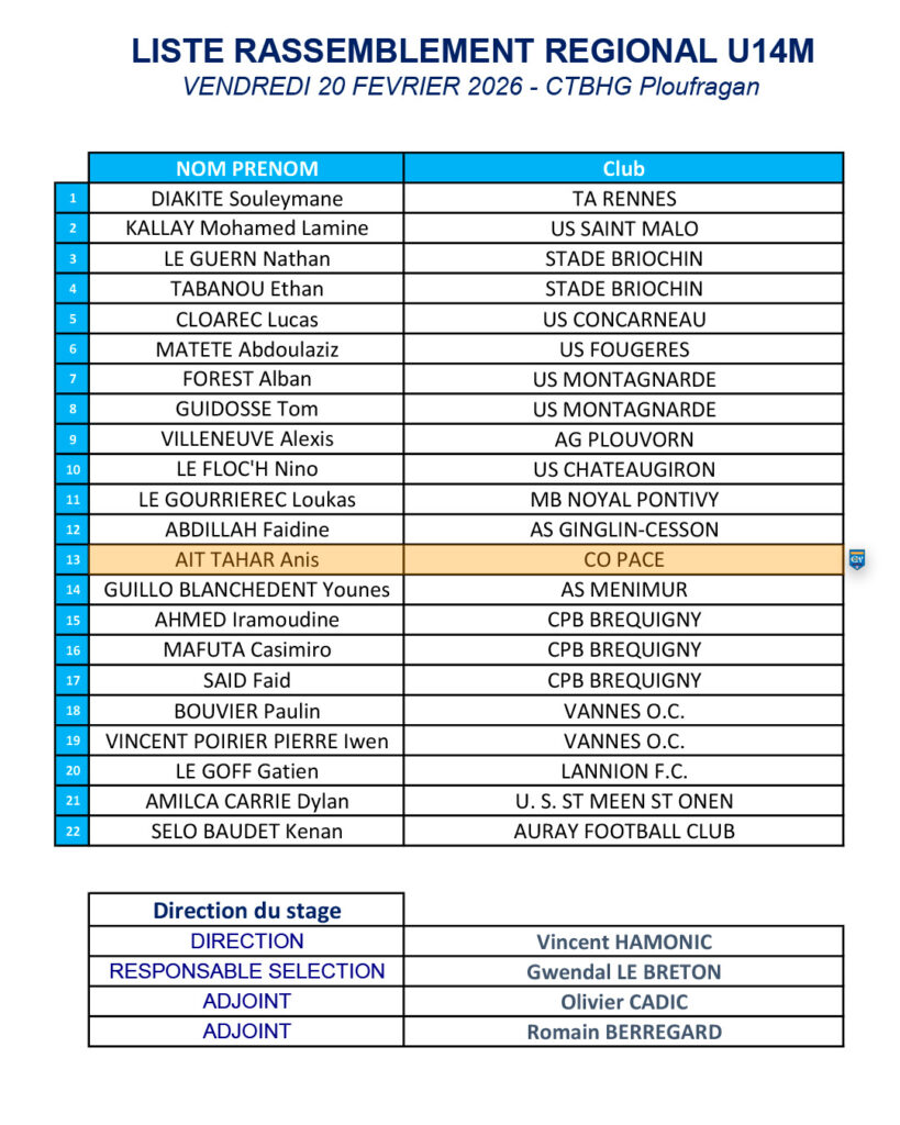 Notre joueur U14, Anis Ait Tahar, a été sélectionné pour le rassemblement régional U14 qui se tiendra le vendredi 20 février à Ploufragan.